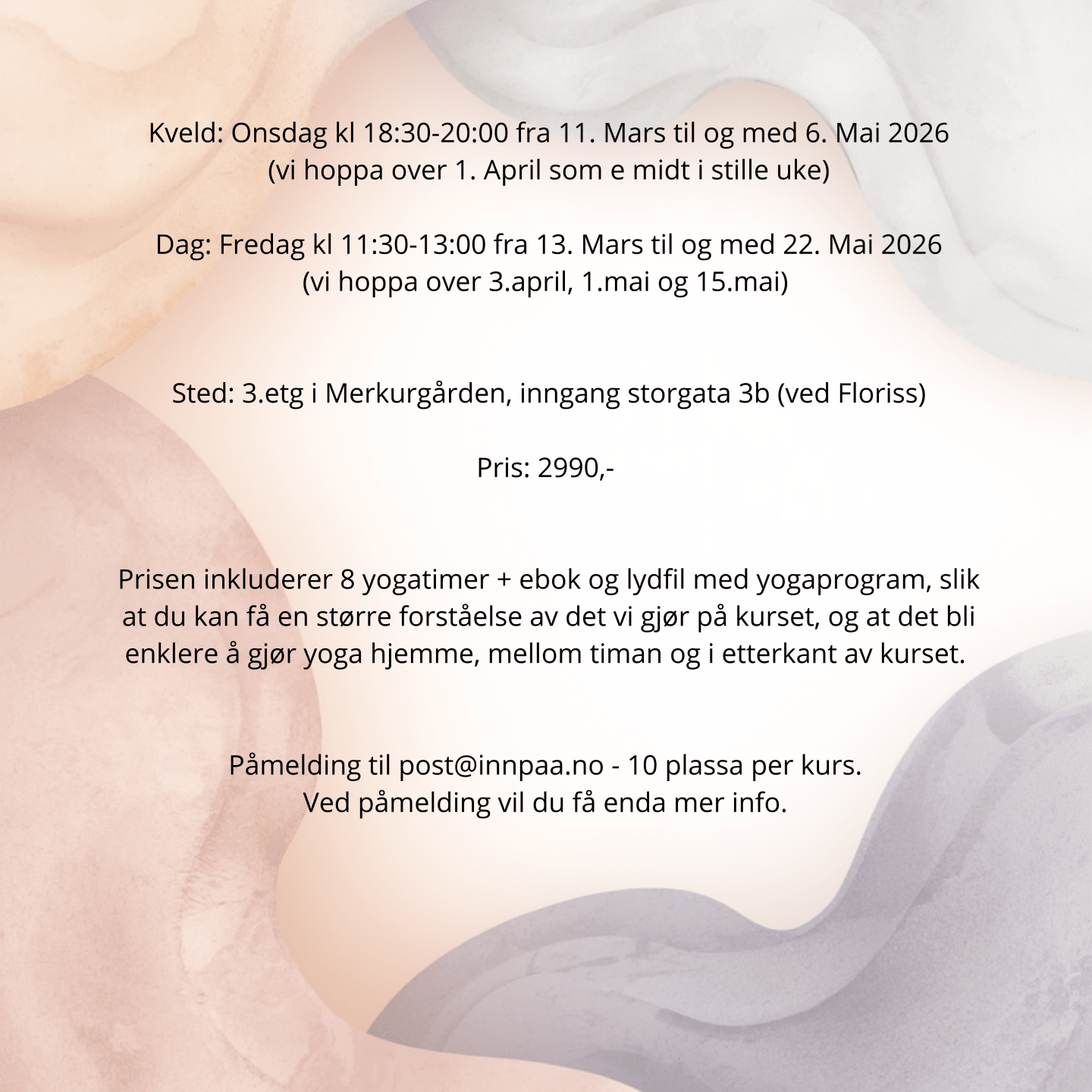 Fra Januar 2026 tilbyr jeg yoga kurs som går over 8 uker. Jeg setter også opp drop in timer etterhvert. Les mer om kurset lenger ned på siden.