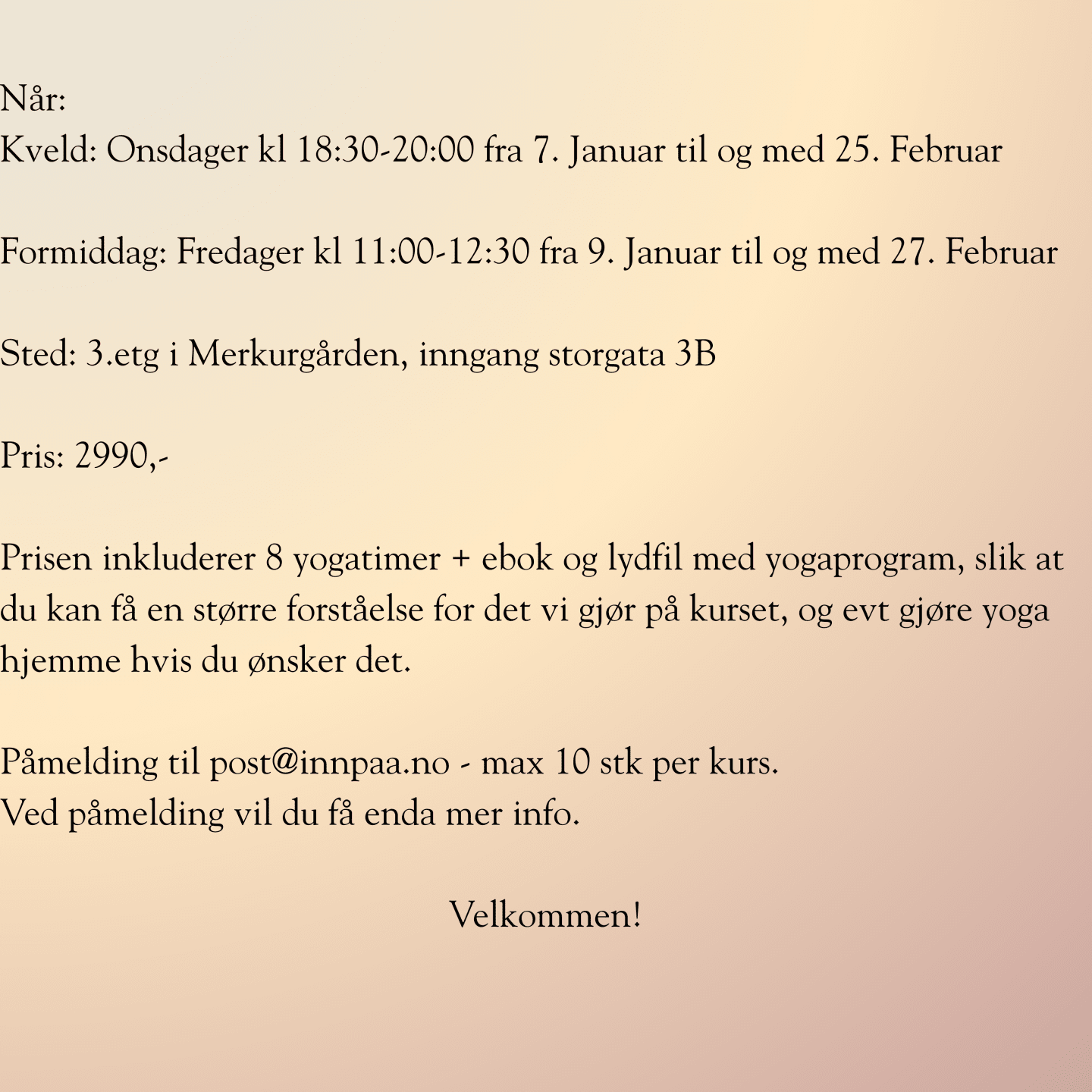 Fra Januar 2026 tilbyr jeg yoga kurs som går over 8 uker. Jeg setter også opp drop in timer etterhvert. Les mer om kurset lenger ned på siden.